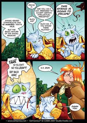 - From Girl Genius comes Krosp III, Emperor of All Cats - basically, a cat with human-level intelligence, speech, thumbs, and the ability to walk erect... he'd like to claim that his 'cat-instincts' have no hold over him, but Agatha rather enjoys proving otherwise. Using a piece of string.