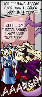 - Irregular Webcomic has one where Monty is going to get excecuted, which he flashed a parody of the early sequence of The Last Crusade, and another one with Lambert, who's seeing a fireball (and might die of one, again).