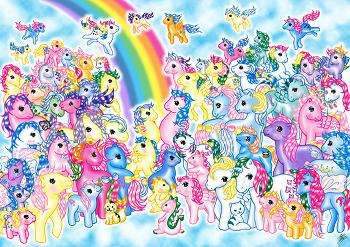 - Fundamentally Female Cast: As a brand aimed at girls, there aren't all that many guys around. They don't exist at all in G3 and only two or so exist in G2. G1 has about fifty male ponies (which is nothing compared to the number of female ponies) and quite a large number of non-pony male characters. G4 has its pony gender numbers around 50/50 (The Friendship is Magic pilot even established that Equestria has more male Ponies).