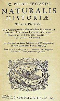 Natural History is an encyclopedia of sorts written by Pliny the Elder, a Roman writer and naval commander who was born in 23 A.D., and died in 79 A.D. of a heart attack while journeying to Pompeii to rescue relatives living there. Natural History is probably the Ur Example of the Great Big Book of Everything, predating Isidore of Seville's Etymologies by 421 years.