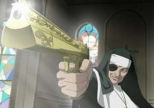 - Sister Yolanda (seen above) from Black Lagoon. In the Greenback Jane arc, she walks in to see her church being attacked... and what does she do? Calmly takes out a gold-plated Desert Eagle and blows up a car in one shot. While holding the gun with one hand. Wow.