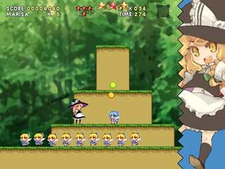 New Super Marisa Land is a 2010 platform game by Twilight Frontier, creators of Super Marisa Land and Mega Mari. In this hybrid of Touhou and Super Mario World, you play as Marisa, who has her mushroom collection stolen by the Three Mischievous Fairies. She must track them down all throughout Gensokyo, coming across various members of the Touhou cast, and beating the tar out of them.