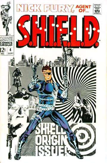 Nick Fury is an immortal superspy. He has been an agent (and later) director of SHIELD, an international security organization. He first appeared in "Sgt. Fury and his Howling Commandos" #1 (May, 1963), created by Stan Lee and Jack Kirby. The Howling Commandos series ran for 120 issues (May, 1963-July, 1974), featuring the World War II adventures of an army unit. In "Fantastic Four" vol. 1 #21 (December, 1963), an older Nick Fury appeared alive and well in the 1960s. He was no longer with the military, instead serving as an agent of the CIA. This version of Fury next appeared in "Strange Tales" #135 (August, 1965), where Fury became the leading agent of SHIELD and the lead of a new series. He has since served as the lead character of several series and magazines. However, the most famous version was the period with Jim Steranko at the helm, that showed arty Surrealism and abstractionism had a place in comics.