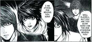 Alice suddenly appears facing Bob, and is ready to attack him. When he notices, she says "I am behind you!" Bob performs a Flash Step, reversing their relative positions. "No, I Am Behind You."