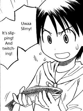 - In Yotsuba&! the fish are depicted as living beings that bleed, much to the distress of Miura (depicted above). They get caught to be eaten and, once cooked into food, even Miura has absolutely no objections.