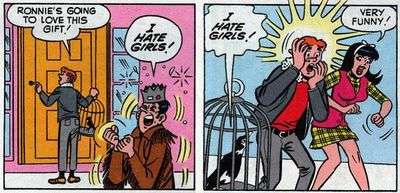 - One Archie comic has Archie planning to give Veronica a mynah bird he's trained to say his phone number whenever she picks up the receiver. However, he shows and tells this plan to Jughead, who spends the entire time getting increasingly upset and loudly voicing his hate for girls. Naturally, by the time Archie gets the bird to Veronica, all it says is what Jughead had been saying.