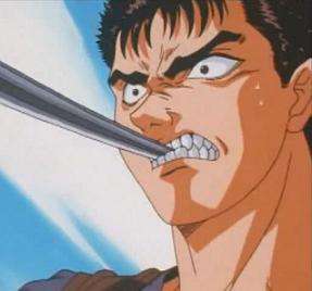 - Quoted almost word for word by Guts in Berserk, when he uses his teeth to catch the tip of Griffith's sword, seen in the page image. It's a tactic he makes use of quite often in fact.