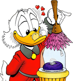 - Carl Barks also did a story in which Scrooge had an actual Number One Dime, a magical hourglass that, when broken, caused his fortunes to start failing on him, as well as creating the Trope Namer as explained above.