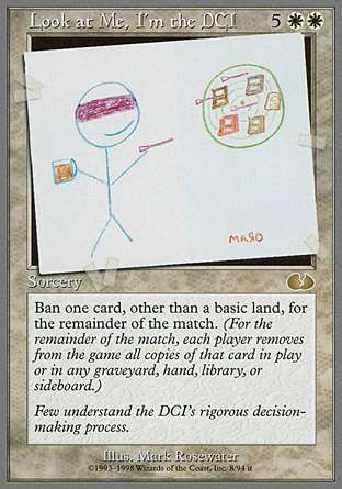 - Lampshaded in the series' own Unglued and Unhinged expansions, with cards like Look At Me, I'm The DCI!, which featured current Head Designer Mark Rosewater's stick-figure drawing of a blindfolded figure picking what to ban by throwing darts at cards pinned to a dartboard. Other Unglued cards have 'errata' printed on the card.