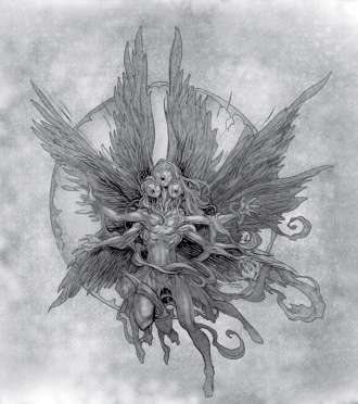 - The Angels of Mnemosyne appear to be a total aversion of the traditional angel archetype. They're former male humans who have had a time spore put into them, have flesh-like wings and monstrous features (including gold eyes with red sclerae), work for the Big Bad who considers himself to be a God, but are monstrous creatures that continually hunt the immortal women of the story in order to consume their time spores. However, right at the end of the series, Rin ingests Tajimamori's angel time spore and sprouts feathery wings when she takes over as the protector of Yggdrasil.