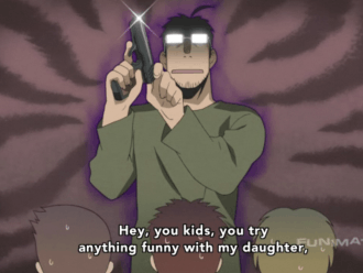 - Pictured above: In Fullmetal Alchemist, Maes Hughes holds three-year-old boys at gunpoint as they attempt to play with his daughter Elysia on her birthday. Complete with Scary Shiny Glasses.