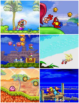 - ↑ Clockwise from top left: Wario Land 4, Plok, Sonic the Hedgehog 3, Donkey Kong Country 3 (GBA), Kirby: Nightmare in Dream Land, and Parodius Da!
