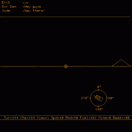 Players choose one of two teams, Squares and Triangles. Each team member starts near their team's base and sets out to destroy the enemy base. Players message each other to coordinate their actions. Each player has an onboard view like Battlezone, and a map view that shows their team, five mountains, and enemy tanks if they are in range.