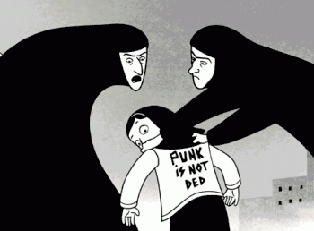 - Moral Guardians: The Iranian Islamic Revolution is this trope, banning all manner of Western media as being decadent and immoral. In Real Life, the Iranian government, angered by the movie's portrayal of them as reactionary, humorless, suppressive, and misogynistic, reacted by humorlessly suppressing the movie and calling Marjane Satrapi a whore.