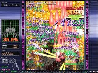 - Crimzon Clover (pictured above) has scores that can go as high as 12 digits long. However, the main highlight of the scoring system is the buttloads of multipliers you get—your Break Rate (which increases as you kill enemies), the lock-on multiplier (shown in green), the Break Rate doubling and quadrupling when you Break and Double Break respectively, and the showers of stars you get. Each and every multiplier you get is shown when you kill enemies, and often you'll have moments where you cancel a screenful of bullets into a screenful of numbers.