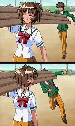- In Tokimeki Memorial 2 Substories: Leaping School Festival, this happens in an Event of Akane's storyline, when the protagonist, surprised and worried to see her carrying such heavy-looking logs (which are no problem for her, being from a family of martial artists), calls her from behind.
