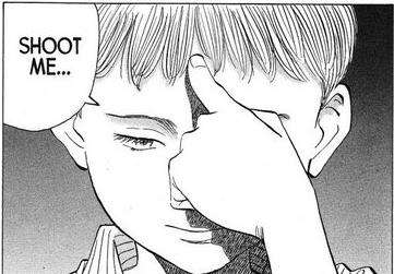 - In Battle Royale (novel and manga), after Yoshimi learns that Yoji intends to kill her, Yoshimi gives up and tells Yoji that he can shoot her. Instead, Yoji is overcome by emotion and does not shoot her, throwing away the gun in regret.