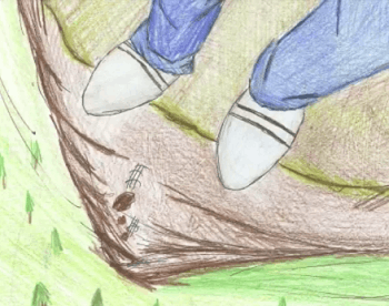 A character is hanging on a ledge for dear life. An inconsequential object falls, and the camera moves into position to show it falling hundreds of feet. This is used to emphasize just how high the hero is, and how horrifying his fate will be if he isn't saved quickly.