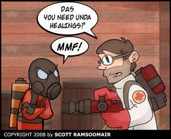 - As the current page image shows, Team Fortress 2. The Medic, the Heavy, and The Spy all speak mostly fluent English, but will revert to their native (?) languages for things like "Yes", "Thank you", and the occasional Foreign Cuss Word.
