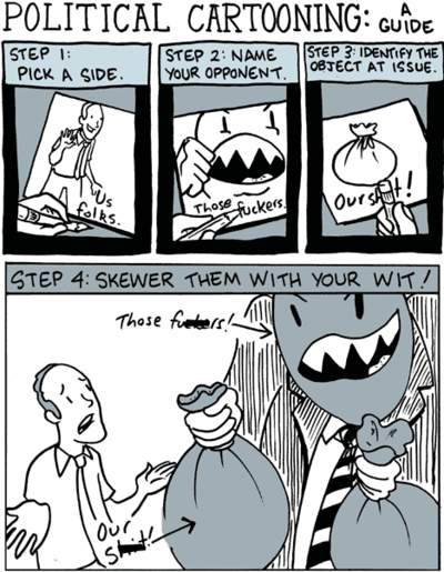 These are those little boxes on the editorial page of your local newspaper where cartoonists try to educate and entertain the masses via their snappy, illustrated political commentary, usually on current events. Done well, a political cartoon will creatively expose the social and political hot buttons of the day; in fact, one of the precursors of the Mexican Revolution was a bunch of perfect political cartoons. Done poorly... well, they're easy to avoid.