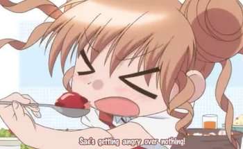- After having a minor squabble with Sae, Hiro of Hidamari Sketch (pictured above) goes on a binge eating tons of food from cake and donuts to curry, always with a "><" on her face and constantly saying things "Stupid Sae"...LesYay? Of course not.