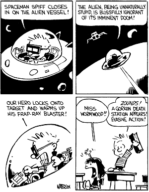 - Calvin and Hobbes is probably the most iconic example of this, and only Calvin has three different instances—Spaceman Spiff (which provides the header picture), Stupendous Man, and Tracer Bullet—of this trope as major recurring characters, plus other fantasies of being a dinosaur.