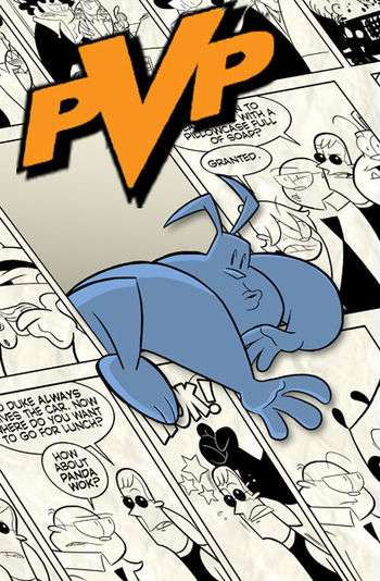 PvP is a gaming webcomic started in 1998 by cartoonist Scott Kurtz. It takes place around the office of a small magazine production company that produces the gaming magazine "PvP", focusing mostly on the office antics of a straightlaced boss, his snobby best friend, their bratty sixteen year old intern, a naive, careless troll, and two frat boys. Over time, the cast gained a female counterpart to the intern, a love interest for the snob in the form of a feminist gamer, and some other characters. It originally started as a pastiche Affectionate Parody of video games and geek culture in general, moving away from that towards just being a slice of life comedy about its characters and an Affectionate Parody of every 80s sitcom ever made.