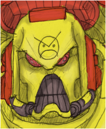 This is when a helmet's visor is embossed with a furious face or something similarly frightening. Merely having scary-looking eye-slits doesn't count, although features that just vaguely suggest a wrathful expression might. Stern looks also count, and might even be scarier than the raging ones. Mecha-Mooks might have this, depending on how their "faces" look. Compare and contrast Malevolent Masked Men (for when the scary visor is the whole point) and Expressive Mask (which actually changes expression). See also Faceless Goons and Gas Mask Mooks.