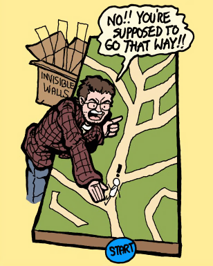 No Sidepaths, No Exploration, No Freedom is a Video Game analogue.