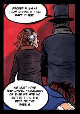 A sub-trope of Even Evil Has Standards when rape disgusts a villain, and the opposite of Rape Is Love. Compare Wouldn't Hit a Girl, Wouldn't Hurt a Child. Contrast Black Comedy Rape. Related to the idea of rape as a Fate Worse Than Death. When refusal to engage in this is a sign of the good guys superiority it is The Women Are Safe with Us.