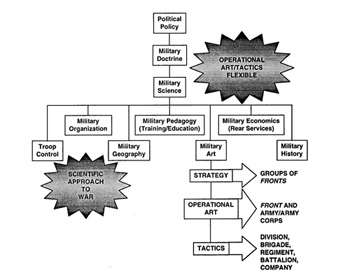 The Soviets approached war in a scientific way. Almost everything is given a definition and structured which may look very rigid and inflexible in Western eyes. The fact is that having a base set of definitions makes sure that everyone can easily understand what is being said. For example, when Soviet officers discuss about, say the "the tactics of a bronegruppa (armored group)” there's no uncertainty about--and therefore no need to define what tactics are, or what a bronegruppa is. This is in contrast to Western military circles, where, for example people often have different or conflicting definitions on exactly what is "operational art".