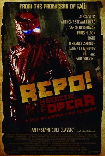 Repo! The Genetic Opera is a 2008 musical film, written and composed by Terrance Zdunich and Darren Smith, and directed by Darren Lynn Bousman (of Saw 2, 3 and 4 fame). It's based on their play of the same name. It's a gory, dystopian and ultimately very moving Black Comedy that never takes itself too seriously. Widely known and loved for its What the Hell, Casting Agency? (see below) and its lush soundtrack, the film has become a modern cult classic. It's also an actual opera: nearly every line of dialogue is sung, and the story is one continuous musical number.