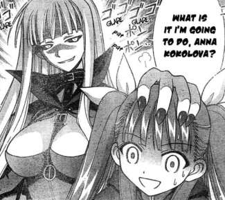 - In a Mahou Sensei Negima chapter, Negi's classmate and childhood friend Anya, upon learning whom the master of the extratemporal keep Negi and his students were using to train is, pulls the closest girl aside and tries to convince her in a frantic undervoice to escape, lest the legendary undead mage Evangeline A.K. McDowell do something horrible to them all. Then a busty, leather-clad blonde woman with fangs and Glowing Eyes of Doom starts patting her on the head, and the above picture happens. Eva really didn't plan to do anything but scare Anya a bit, and in fact generally enjoys being told how powerful and evil she is.