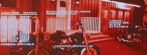 Whenever the camera assumes the POV of a robot, we see how the robot sees the world, which is always as a kind of computer readout. It's usually slightly pixellated, often tinted, and frequently has a grid laid over everything. They can zoom in and out, and are capable of picture-in-picture (e.g., when they see a person they might bring up a file photo of them). Most importantly, words, numbers, enemy strengths and weaknesses and various other data will flash across the screen, identifying people and items, reminding the robot of its objectives, contemplating possible courses of action, or sometimes just flashing little scrawls of code that mean nothing to the viewer.