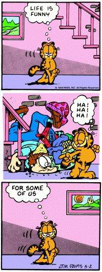 - Garfield. Lots of the humor revolves around Garfield, Jon, and Odie (usually the latter two) being injured. In one strip, Garfield kicks Odie off the table, then drops a freaking vase on him.