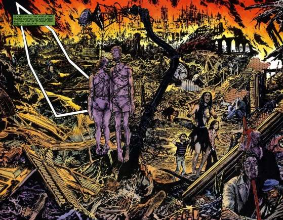 - One comic in the Marvelman series, featuring Kid Marvelman, has London becoming just about the closest definition of Scenery Gorn after he goes on a murderous rampage through the city and gruesomely murders nearly every inhabitant in a highly disturbing manner. Some of the things shown include people running from a rain of severed hands and feet, skins hung up on clothes lines, corpses impaled on the hands of Big Ben, the Tower Bridge in ruin, mounds of severed heads, heads on pikes, cars full of people plummeting to earth, mutilated children wandering screaming through the streets, and countless dead bodies.