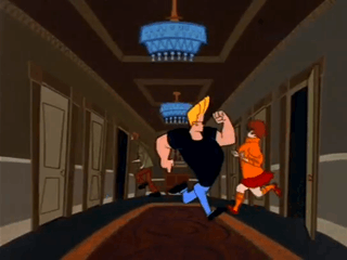 - Johnny Bravo used it during the self-referential Scooby-Doo Crossover episode "Bravo-Dooby Doo". Eventually, it gets to the point where there are multiple Johnnys running through the doors at the same time.