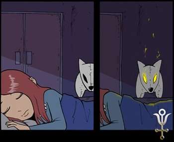 - A rather literal example existed in an episode of The Outer Limits, where a Teddy Bear underneath the bed lures a kid by having it claim that he's scared of the dark and wants him to pull it out. The boy is then sucked under the bed to his sister's horror. Foreshadowing this, the bear starts ominously stating "little boy" and has its eyes open to reveal them to be red.