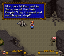 The game itself is rather short, compared to Secret of Mana and other Square-Enix titles; it's also extremely linear, with no side-quests and a straightforward 'defeat the villain' premise. Otherwise, Secret of Evermore is fairly entertaining, with the boy constantly comparing his predicament to various (fictional) movies, and the dog shape-shifting into different forms, depending on which part of the game-world they're in.
