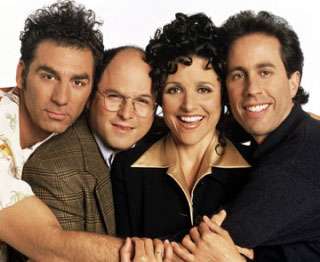 Okay, seriously. One of the most popular shows of The Nineties, it mostly centered around unpleasant people doing unpleasant things to Innocent Bystanders, following Unsympathetic Comedy Protagonists Jerry, Elaine, George and Kramer. It lasted for nine years (1989 to 1998) and as many seasons, only ending when Jerry Seinfeld himself refused to go on, even after being offered 5 million dollars an episode for a tenth season.