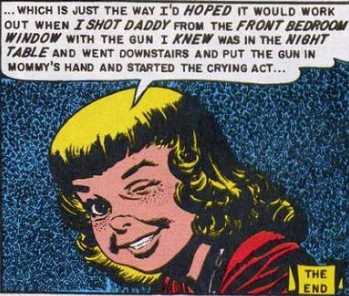 - The notorious 1954 EC Comics story "The Orphan" [dead link] featured a little girl who kills her abusive father and then frames her neglectful mother and her lover for the murder (resulting in their on-panel execution in the electric chair).