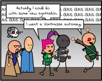 - More Dakka: Krin seems fond of this. Lampshaded in one of the first strips when Severus points out Krin carries 5 guns but only has 2 hands