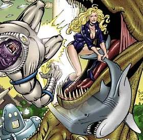 (not to be confused with Black Canary) is hitting a gorilla with a shark...a gorilla in a spacesuit...while standing in a dinosaur's mouth...wearing high heels...being stared at by a robot...
