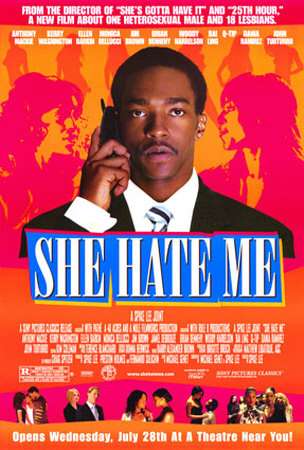 She Hate Me is a 2004 comedy-drama film directed by Spike Lee. John Henry "Jack" Armstrong (Anthony Mackie) is a Harvard graduate and a financially successful, upwardly mobile executive at a biotechnology firm. After a colleague commits suicide, Armstrong uncovers corrupt business practices and attempts to blow the whistle. He's promptly fired on false grounds of security fraud, and his assets are frozen. Things are looking bleak, when all of a sudden his ex-fiancée Fatima Goodrich (Kerry Washington), who came out as a lesbian and broke up with him 4 years ago, turns up at his door. She and her girlfriend Alex Guerrero (Dania Ramirez) offer him a proposition; they want babies, and they're willing to offer him $10,000 dollars to impregnate them both. After he reluctantly (oh come on) agrees, Fatima brings him friends of hers, all of whom likewise want kids and are willing to pay him $10,000 to impregnate them. He acts as though it's hell (give us a break...) Meanwhile, he pushes for his whisteblowing to be taken seriously.