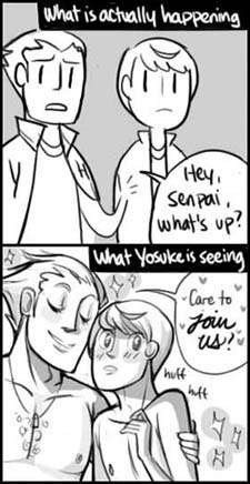 Shipping Goggles is when a viewer interprets the smallest, most ambiguous canonical evidence in favor of their ship of choice. Maybe that glance lasted just a little too long, or that remark in that conversation could be interpreted as innuendo. The ship in question can range from one that seems entirely plausible but doesn't yet have clear canon evidence, right up to a Crack Pairing between characters who are bitter enemies, or live in different universes, or whose sexuality or circumstances makes any relationship between them extremely unlikely. Reasons for putting on Shipping Goggles vary; sometimes it's just wishful thinking, sometimes it's to defend the ship against other competing ships, and sometimes it's Just for Fun.