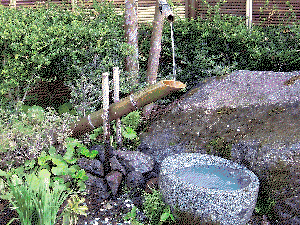 This is a traditional water feature that is found in the yards of Japanese homes, properly called a shishi-odoshi or "deer scare"/"deer-chaser". It has a bamboo cup on a fulcrum that slowly fills with falling water. When it fills, it tips over and empties; when it flips back upright, its hollow back end hits a stone underneath it and makes a distinctive hollow-log "doink" sound. With a simple two-second shot of this device doing its thing, it is established without a doubt that this Big Fancy House is a place of wealth and tradition. Of course, if the doinker happens to be in a Western home, you can bet that they're a New Age Retro Hippie who recently converted to Zen Buddhism and insists that the doinker "balances the home's chi" or whatever.