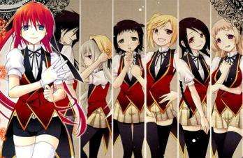 - Early-Bird Cameo: The picture at the top is from the first chapter of the series, showing the (presumed) "harem" of the main character. After three volumes, the last of the characters in the picture finally appears, and not all of them are under Sora's protection or have even met her. One is The Mole (she eventually has a Heel Face Turn). Another is crossdressing to be a member of the all male student council.