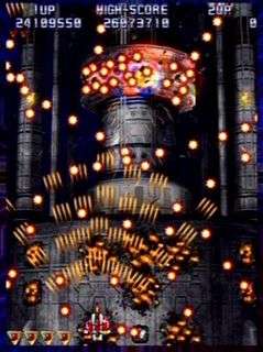 Power Ups typically increase the power and spread pattern of the primary weapon, which is usually fired continuously from the start of play until the end. Usually, a limited number of screen-clearing Smart Bombs are included to get the player out of a jam in a hurry. Many later games end their levels with a giant Boss Battle.