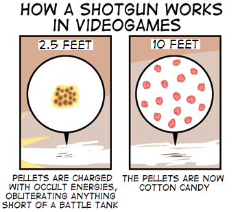 In the real world, shotguns are a weapon with an effective range anywhere from 20 to 40 meters (133 feet) depending on the choke used and amount of charge in the shell. Which is laughably short compared to the tiniest caliber rifle or carbine, but enough to be lethally dangerous for game or whichever people happen to be in vicinity. But in Video Games, this range is invariably about ten feet: anything farther away will rarely ever receive more than Scratch Damage, but anything inside this range will be quickly reduced to the consistency of chunky salsa.