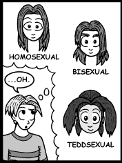 - Grace from El Goonish Shive is "Tedd-sexual". To expand on this, it appears to be simply a result of her Uryuom heritage—the Uryuom being a One-Gender Race of alien shape-shifters. Since they can change their external shape basically at will, they form relationships based primarily on concepts and mental connections. Grace, being 1/4th Uryuom (or so), has inherited this disposition. However, in one non-canon story where reality becomes altered so that Tedd is (and always was) female, Grace hooks up with a different character instead (way to go Sarah!). Although this might be explained by the way, like in every alternate universe where the two are of different genders, the female Tedd and Elliot are in a relationship.